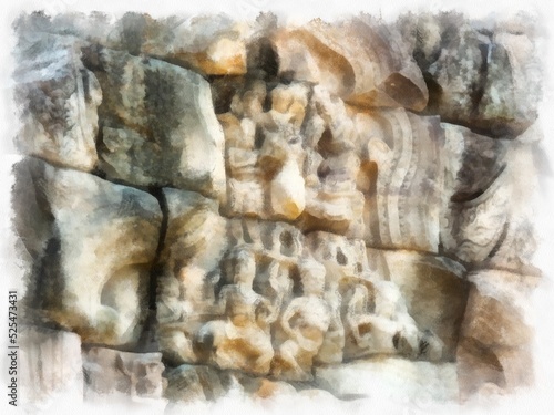 Ancient stone castle and ancient pattern art in Thailand watercolor style illustration impressionist painting.