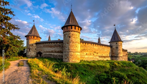 castle, stone, ancient, tower, mediaeval, fortress, dawn, sunrise, sunset, hill, landscape, panorama, travel, history, europa, tour tourism, ruin, architecture, exterior, summer, green, path, nature, sky, cloud, granite, historic, sunlit, view, stone wall
