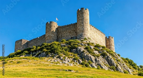 castle, stone, ancient, hill, rocky, tower, fortress, mediaeval, historic, ruin, landscape, hilltop, fort, defense, structure, old, grey, masonry, grass, vegetation, nature, scenic, view, blue, sky, sunlight, sunlit, flag, historical, historical building, tour tourism, travel, destination, europa, heritage, exterior, architecture, granite, elevation, grand, imposing, protection, strong