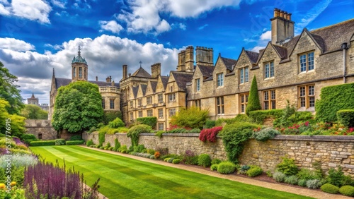 Ancient stone walls of Balliol College Oxford University surrounded by historic buildings and picturesque gardens