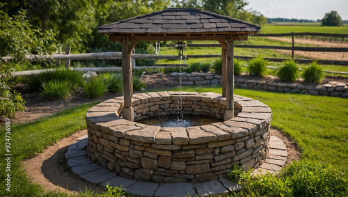 Ancient stone well surrounded by tranquil garden, a serene Japanese park oasis