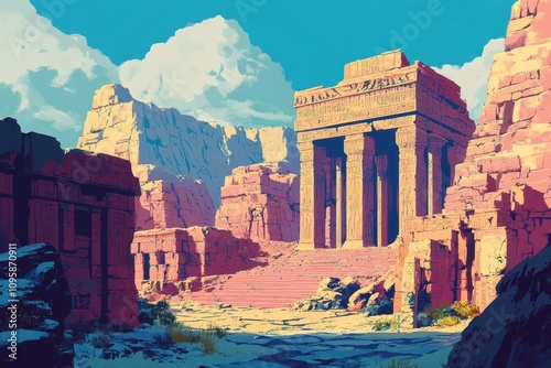 temple, ruin, desert, landscape, stone, ancient, column, pillar, architecture, sky, cloud, mountain, sand, sun, light, shadow, structure, entrance, step, pathway, weathered, eroded, abandoned, historical, civilisation, history, mystery, exploration, travel, art, illustration, digital, painting, artwork