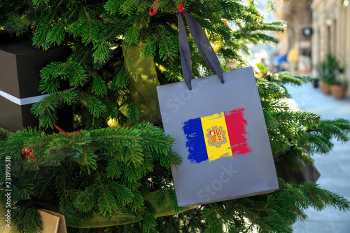 Andorra flag printed on a Christmas shopping bag. Close up of a shopping bag as a decoration on a Xmas tree on a street. New Year or Christmas shopping, local market sale and deals concept.