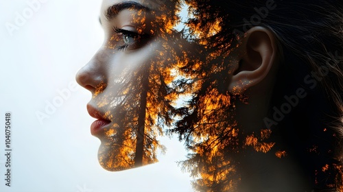 Androgynous face reflected in glass, double exposure with forest silhouettes, capturing nature and humanity connection, warm and natural tones