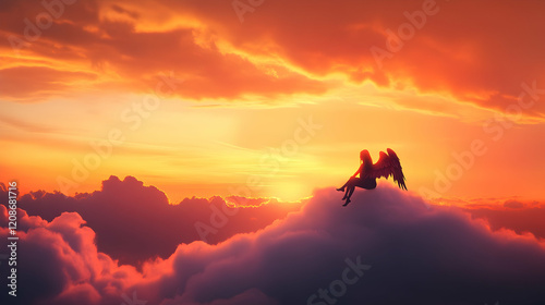 Angelic figure sits on a cloud, sunset backdrop, peaceful scene, spiritual concept art