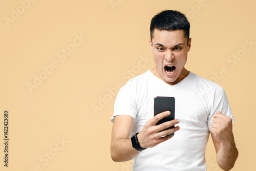 anger, loss, online, upset, excited, student, guy, white, t-shirt, look, smartphone, unexpected, message, isolated, light, background, empty space, device, studio shot, work, young, man, emotion, succeed, male, people, offer, advertising, cut-out, person, lifestyle, advertisement, hipster, sad, furious, pain, banner