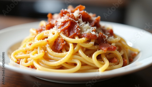 Angled shot of a plate of spaghetti carbonara, topped with crispy pancetta and Parmesan cheese.