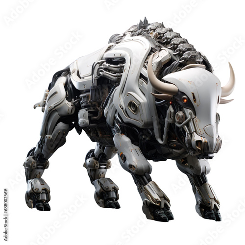 white, robotic, animal, bison, isolated, transparent, background, three-dimensional, technology, futuristic, mechanical, toy, innovation, machine, electronic, design, modern, artificial, intelligence, creature, cybernetic, angle, perspective, dynamic, motion, creative, concept, engineering, digital