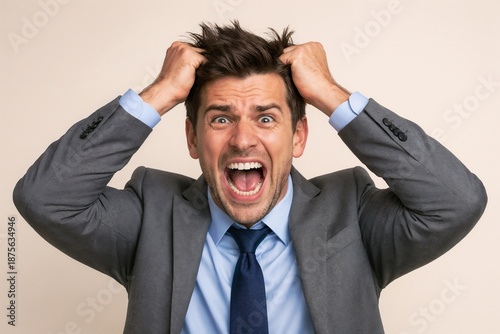 Angry Businessman Screaming and Pulling Hair in Stress and Frustration