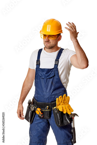angry caucasian repairman worker in yellow hard hat and uniform. handyman wearing tool belt isolated on white studio background