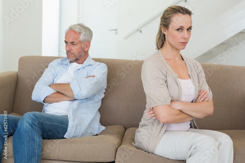 mature adult, man, male, caucasian, woman, female, home, house, household, apartment, domicile, abode, living room, leisure, lifestyle, sitting, sofa, couch, couple, human relationships, together, argument, unhappy, frowning, thoughtful, thinking, annoyed, angry, fight, disagreement, portrait, indoor