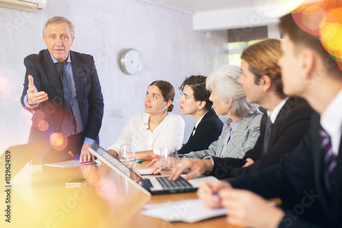 Angry elderly male boss scolding office workers of different ages using notebooks at table in office