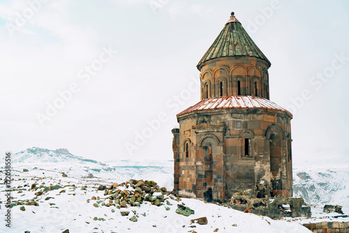 snow, church, architecture, view, drone, travel, old ruin, winter, history, religion, photo, stone, outdoors, ancient, mountain, horizontal, east, famous place, ruined, sky, culture, color image, christianity, travel destination, anatolia, old, spirituality, turkey, cathedral, landscape, weather, ruin, armenia, city, cold, desert, historical, journey, landmark, day