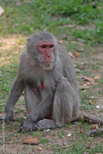 Animal, a monkey sits on ground, waits the food from people who see it, it lives in KUM PHA WA PI park, at UDONTHANI province THAILAND.