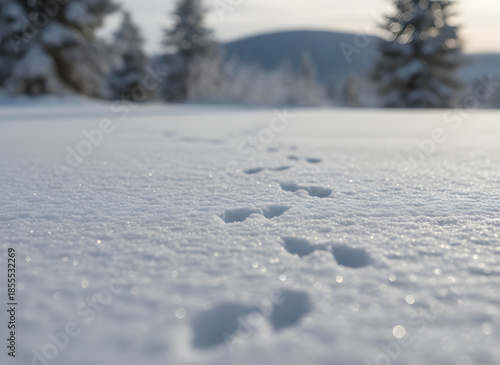 Animal footprints crossing fresh snow in a quiet winter landscape with soft light and blurred forest background creating a peaceful cold season mood