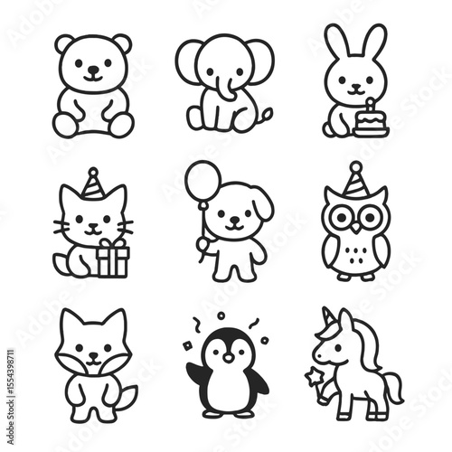 animal, party, icon, outline, icon, set, for, card, cartoon, bear, baby, elephant, rabbit, with, cake, cat, puppy, balloon, owl, wearing, hat, fox, gift, penguin, confetti, unicorn