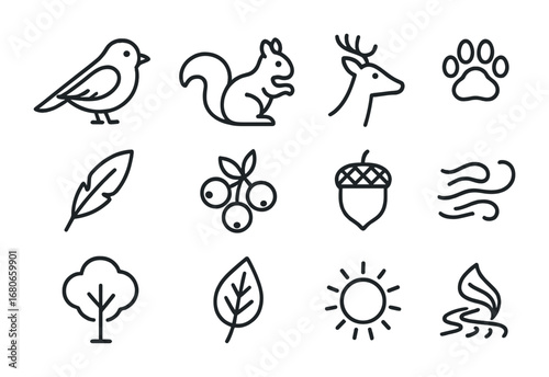 animal, seed, dispersal, icon, outline, icon, set, assisted, bird, squirrel, cervid, paw, print, feather, berry, acorn, wind, river, tree, leaf, sun