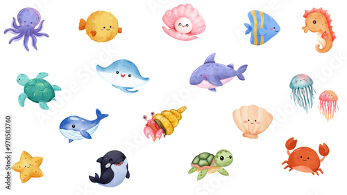 fish, sea, cartoon, animal, vector, ocean, water, set, illustration, octopus, dolphin, aquarium, baby, starfish, marin, shark, animal, whale, life, underwater, nature, turtle, tropical, crab, design