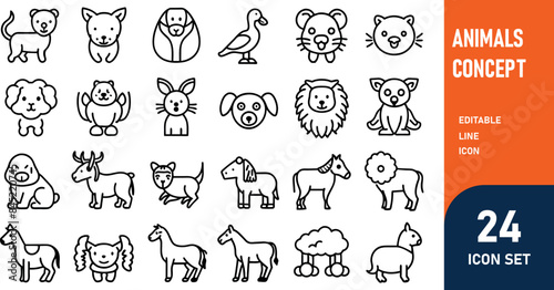 Animals related concept such as Dog, cat, horse, pig, sheep, goat, chicken, bird, fish & many more editable stroke outline icons isolated on white background flat vector illustration