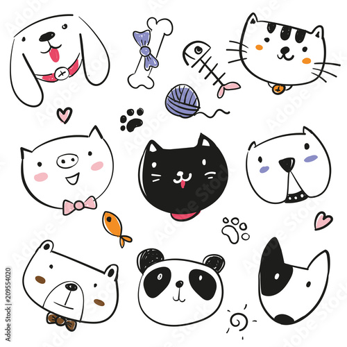 character, illustration, isolate, vector, cartoon, design, art, draw, colours, group, drawing, animal, collection, cute, friendly, funny, graphic, happy, nature, smile, wildlife, icon, object, vignetting, dog, cat, pig, panda, fish, threaded, mackerel, footprint, foot, face