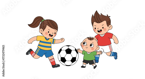 Animated children playing soccer on a white background, featuring girl, boys, and a baby enjoying