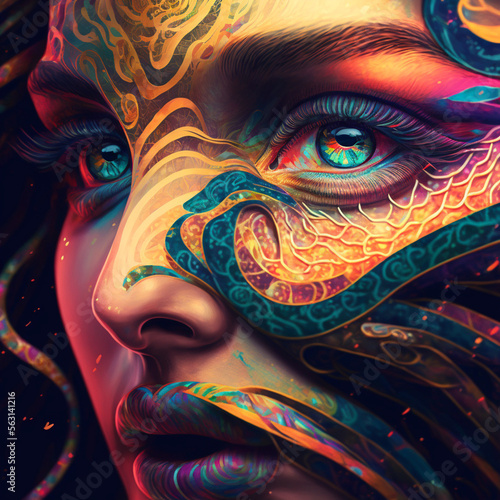 animated face of a girl with blue eyes with multi-colored ornaments on her face on a black background