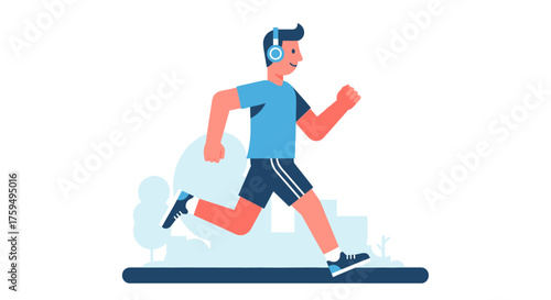 man, running, jog, jogging, athlete, exercise, fitness, physical exercise, active, sport, training, cardio, health, healthy, lifestyle, well-being, movement, motion, speed, fast, track, path, ground, shoe, short, shirt, blue, red, white, happy, smiling, cheerful, listening, music, earphones, audio, sound, technology, device, contraption, illustration, vector, design, graphic, style, modern, flat, simple, minimalist