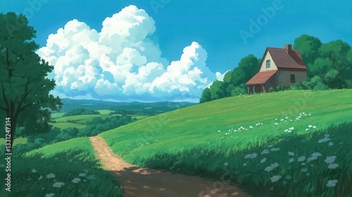 anime, background, gorgeous, painting, pastel, artwork, land, path, meadow, image, scene, village, drawing, tree, hill, rural, illustration, home, cartoon, cloud, art, settlement, house, bungalow, blue, sky, vector, flower, colourful, sunny, grass, green, field, nature, road, country, farm, season, spring, summer, building, beautiful, garden, countryside, landscape, park, forest