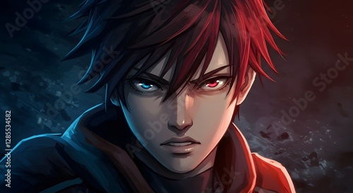 blue eye, red eye, intense, conflict, struggle, fantasy, gaming, animation, digital artwork, illustration, manga, anime, closeup, portrait, dramatic, dark background, action, tension, hero, villain, conceptual, graphic design, passionate, focused, strong, red hair, black hair, emotional, powerful, digital illustration, young adult, adult, fantasy art, dark, artistic, art