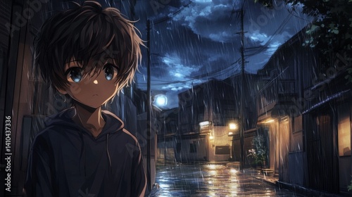 Anime cityscape at night with a cute boy embracing the urban atmosphere, vibrant lights and moody ambiance