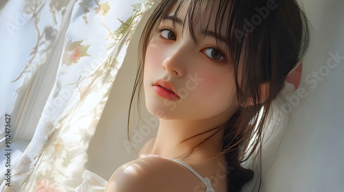digital artwork, fantasy, girl, white, anime, beautiful, portrait, aesthetic, dreamy, female, illustration, floral, sun, wallpaper, light, background, window, eye, brown hair, pink, art, soft, cute, curtain