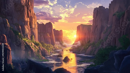 Anime mystical canyon with towering rock formations, a river cutting through the landscape under a setting sun