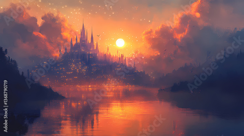 dusk, scene, fantasy, city, castle, soft, hue, setting, sun, city landscape, tranquil, lake, wisp, glowing, cloud, float, creative, aethereal, dreamy, atmosphere, cover, generative, ai, content, illustration