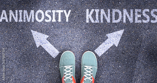 Animosity and kindness as different choices in life - pictured as words Animosity, kindness on a road to symbolize making decision and picking either one as an option, 3d illustration