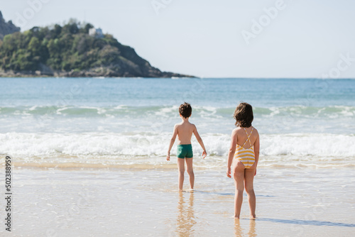children, sibling, beach, coast, childhood, rest, sea, water, shore, pastime, recreation, leisure, seacoast, seacoast, resort, adorable, summer, children, boy, girl, summer, tropical, nature, trip, salt water, travel, adventure, wet, ripple, playful, brother, sister, sand, traveler, journey, tour tourism, horizontal, outdoors, unrecognizable, anonymous, faceless, backview, full body