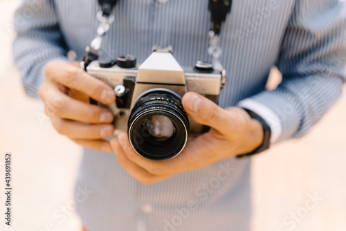 anonymous, blur, camera, closeup, crop, electronic, equipment, sharpened, hand, lens, male, man, photo, photographer, photo, professional, retro, shirt, stylish, technology, vintage, zoom