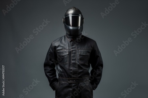 mysterious, racing, suit, helmet, anonymous, black, outfit, motor, full, gear, protective, clothing, motorsport, concealed, identity, safety, racer, uniform, professional, solitude, portrait, person, standing, dark, background, visor, faceless, enigmatic, unrecognizable, activewear, style, design, fashion, equipment, competition, race, driver, cool, sleek, secure, incognito, studio, shot, horizontal, copy, space, adult, modern, elegance
