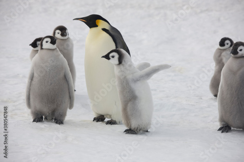 Antarctica emperor penguin chicks with parents close up on a cloudy winter day