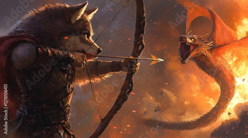 wolf, archer, dragon, fantasy, mythical, creature, battle, fire, arrow, bow, fiery, legendary, beast, conflict, combat, magic, myth, epic, heroic, brave, powerful, fearless, determined, skilful, dangerous, wild, intense, dramatic, action, art, digital, painting, illustration, artwork, wildlife, animal, mythology, legend, wing