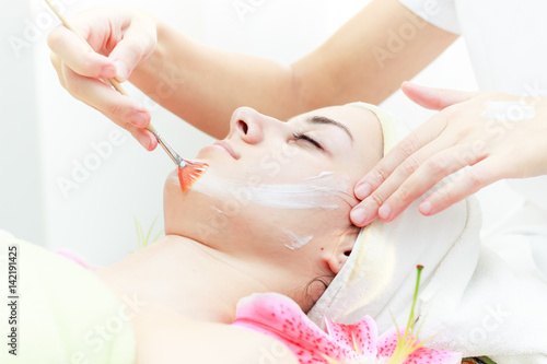 Anti ageing facial mask.Beautiful young woman receiving facial mask at beauty salon