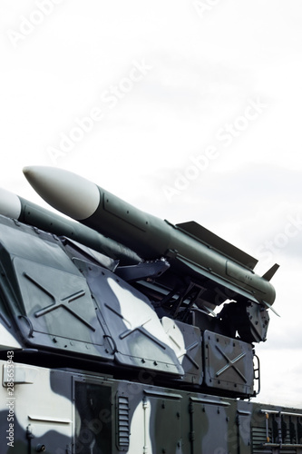 Anti-aircraft missile system. Green army vehicle. Close up view