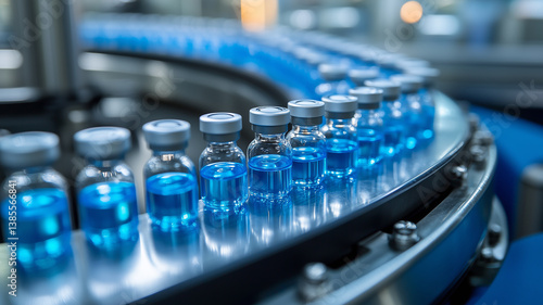 antibiotic, ampoule, production, pharmaceutical, manufacturing, medicine, medicals, health care, science, laboratory, conveyer, belt, factory, industry, blue, liquid, fluid, glasses, bottle, cap, silver, metal, technology, equipment, automated, automation, process, line, assembly, research, development, drug, treatment, make well, vaccine, sterile, clean, modern, high technology, precision, quality, control, inspection, testing, analysis, pharmaceutical, medication, conveyer belt, test