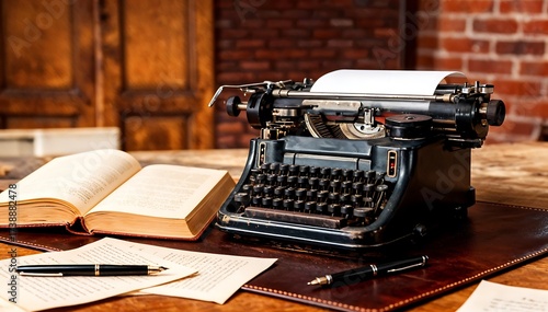 typewriter, antique, vintage, writing, book, open, wooden, desk, pen, black, old, brick, indoor, study, classic, retro, author, journalist, creative, literature, reading, still life, paper, text, document, machine, brown, closeup, nostalgic, leather, workplace, office, education, history, type, keyboard, typing, business, write, key, object, manual, equipment, old-fashioned, alphabet, obsolete, nostalgia