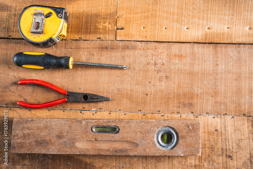 Antique construction tools, such as an old wooden level, a wooden plane, pliers, and a plumb line, are isolated and display an antique charm on a brown wooden wall.