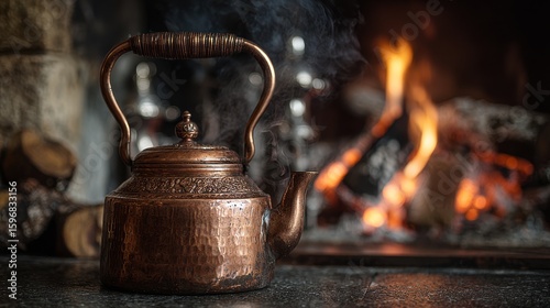 kettle, antique, copper, steaming, fireplace, glowing, ember, vintage, metal, hot, steam, fire, flames, ember, warm, cosy, rustic, traditional, indoor, comfort, heating, old, fashioned, classic, bronze, gold, peaceful, home, hearth, winter, autumn, relaxation, nostalgic, photo, closeup, closeup