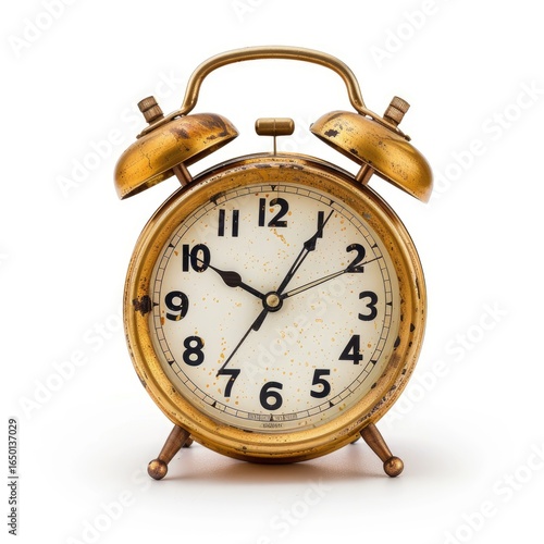 clock, alarm, antique, gold, vintage, metal, time, weathered, rusted, aged, round, face, hand, number, ticking, sound, bell, wake up, morning, hours, minute, second, display, brass, gold, retro, classic, nostalgic, isolated, white, background, still life, object, simple, design, detail, precise, accuracy, accurateness, symbol, duration, schedule, reminder, moment, past, future, present, chronometer, instrument