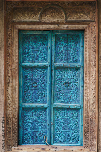 Antique Hand-Carved Wooden Door with ornate blue floral design. The traditional hand-carved wooden door. The craftsmanship and cultural heritage of Southeast Asia.