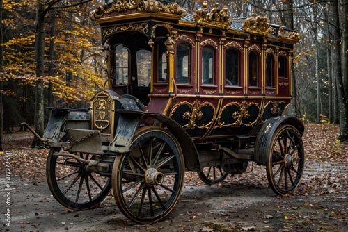 Antique horse carriage with gold details parked on a path in a forest during the fall season, evoking a sense of history and elegance