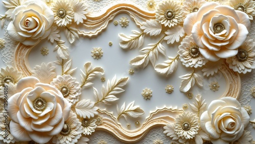 antique, lace, flower, floral, design, texture, pattern, intricate, craftsmanship, three-dimensional, rose, gold, white, cream, beige, elegant, delicate, detailed, hi-res, background, wedding, vintage, decorative, ornament, art, craft, hand-made, luxury, beautiful, romantic, feminine, subtile, embroidery, pearl, motif, damask, relief