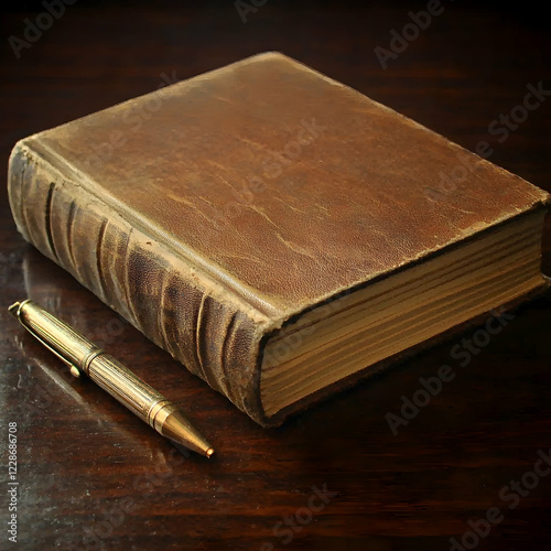 Antique leather-bound book, pen, dark wood desk, research, history